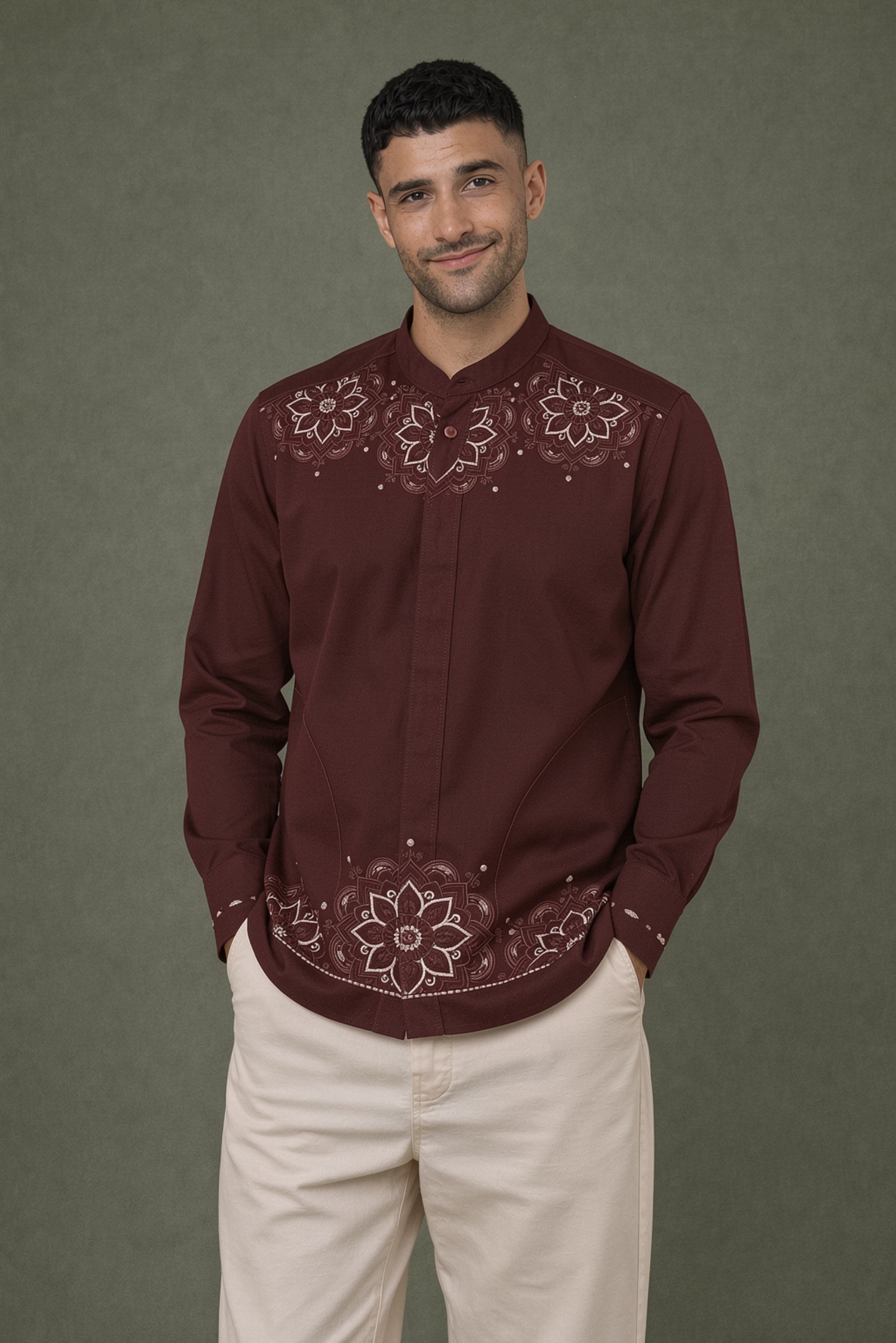 • Terdapat bordir dengan aksen motif bunga mandala di bagian bahu, dada atas dan bawah baju