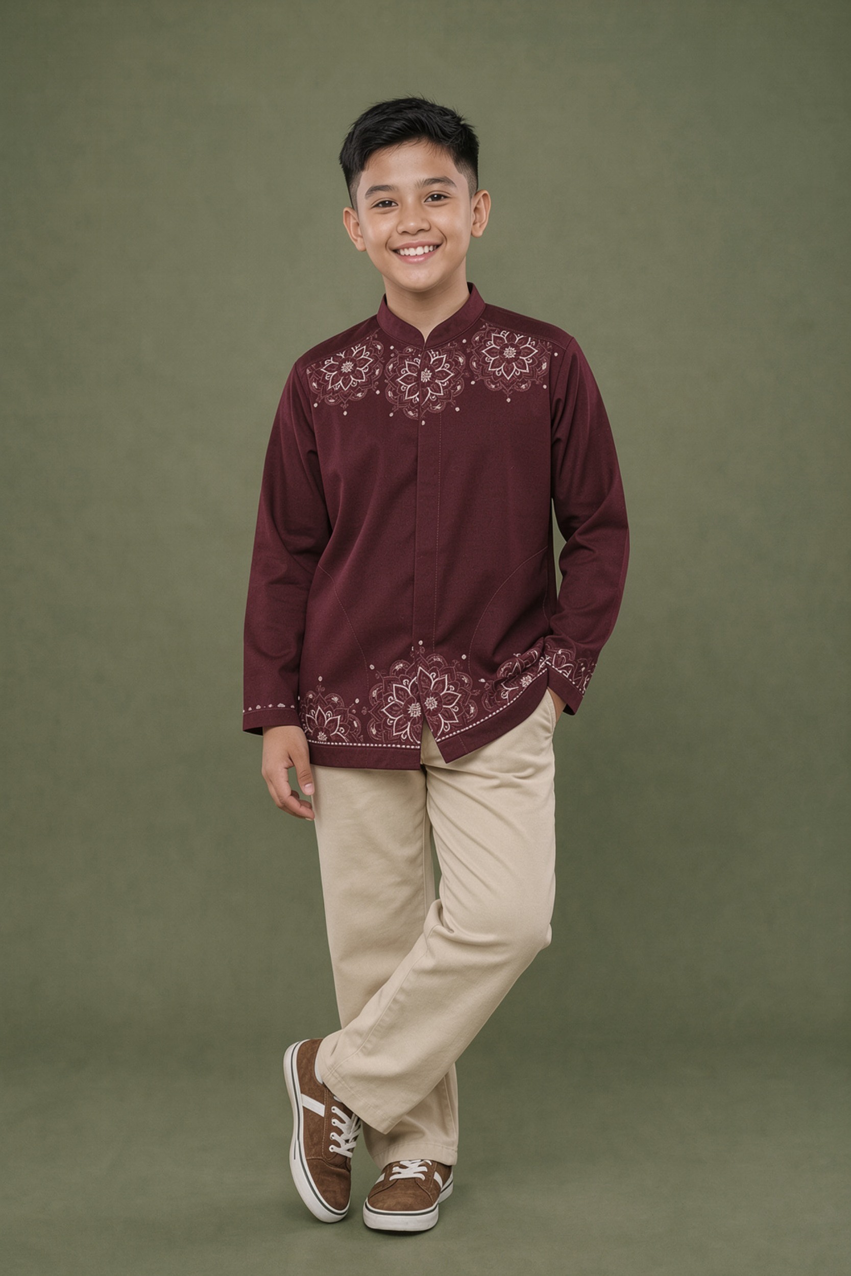 • Burgundy warna pada kerah