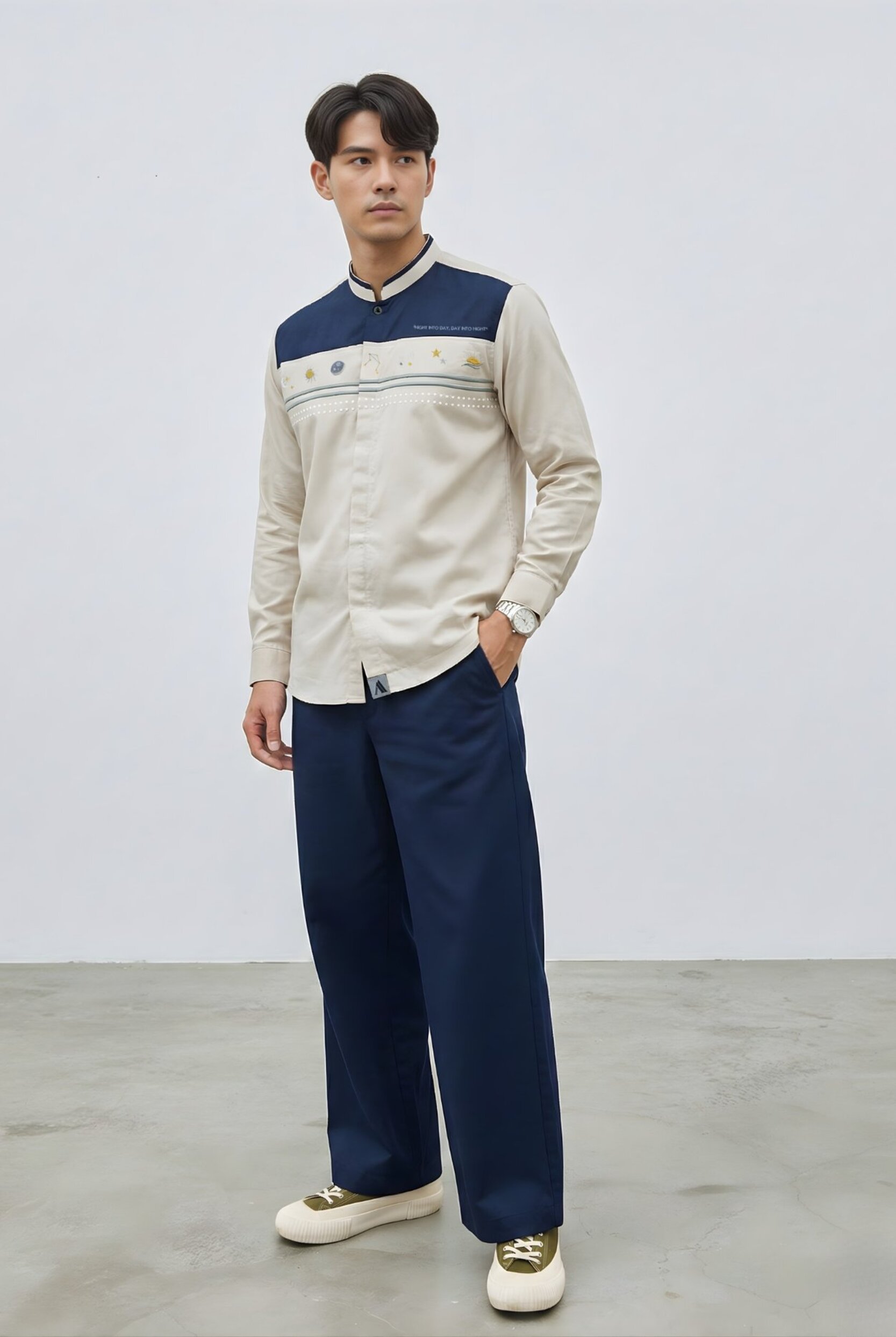 Kerah * Model kerah mandarin * Kerah berwarna light cream * Kombinasi list berwarna navy