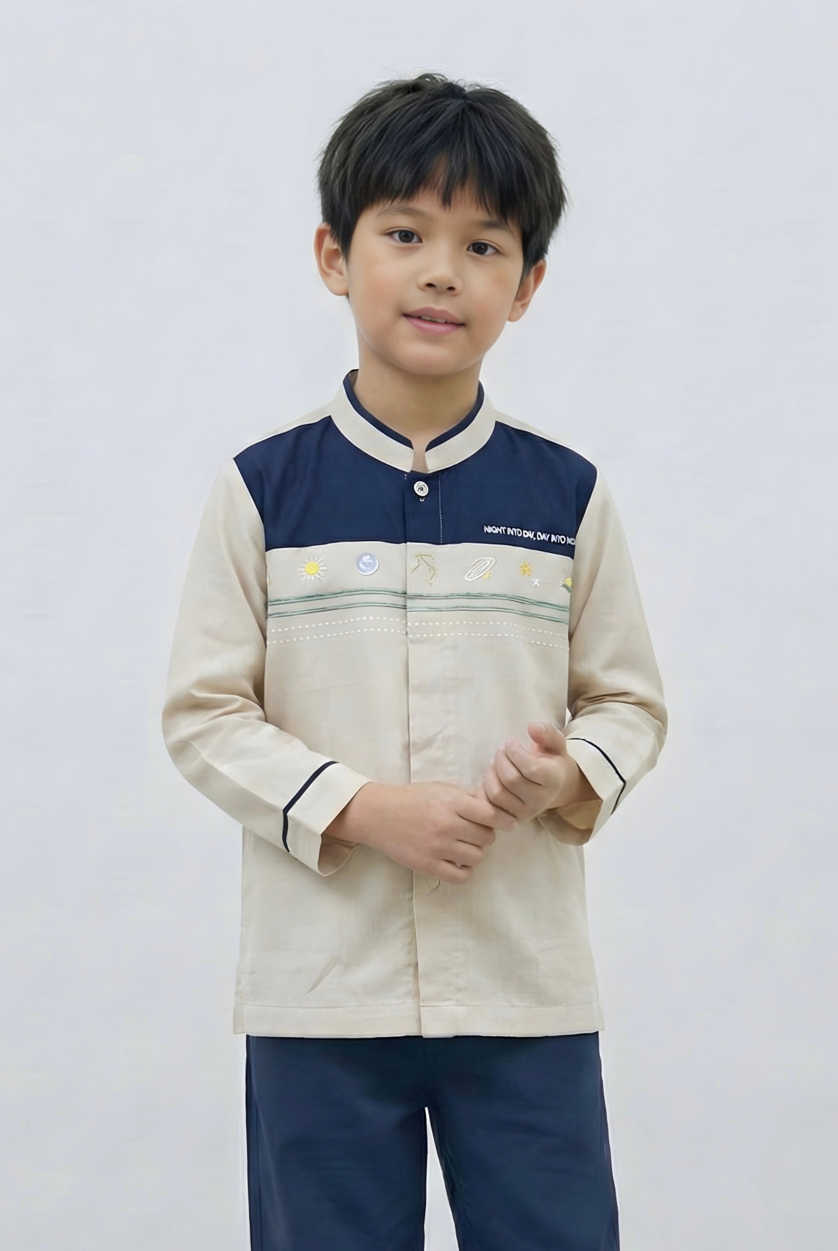Warna baju : - Light cream warna dasar baju - Kombinasi warna navy di bagian list kerah, depan dada, dan list lengan