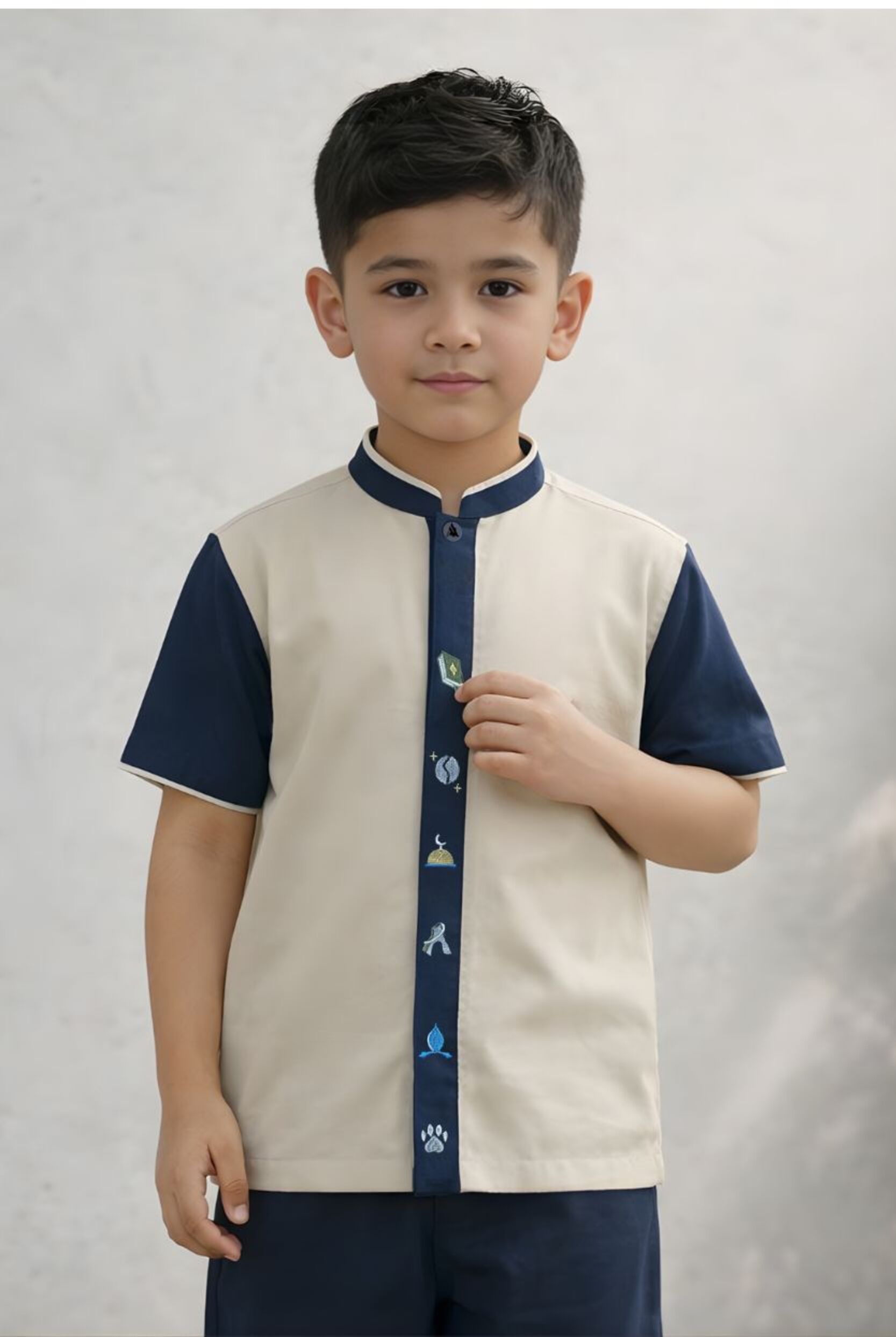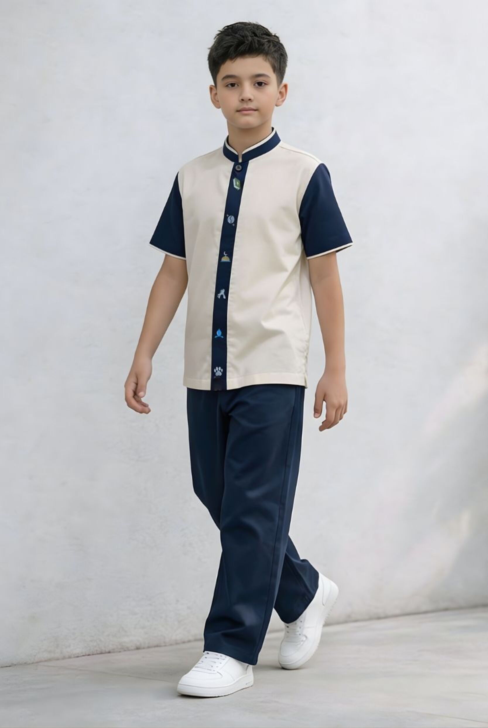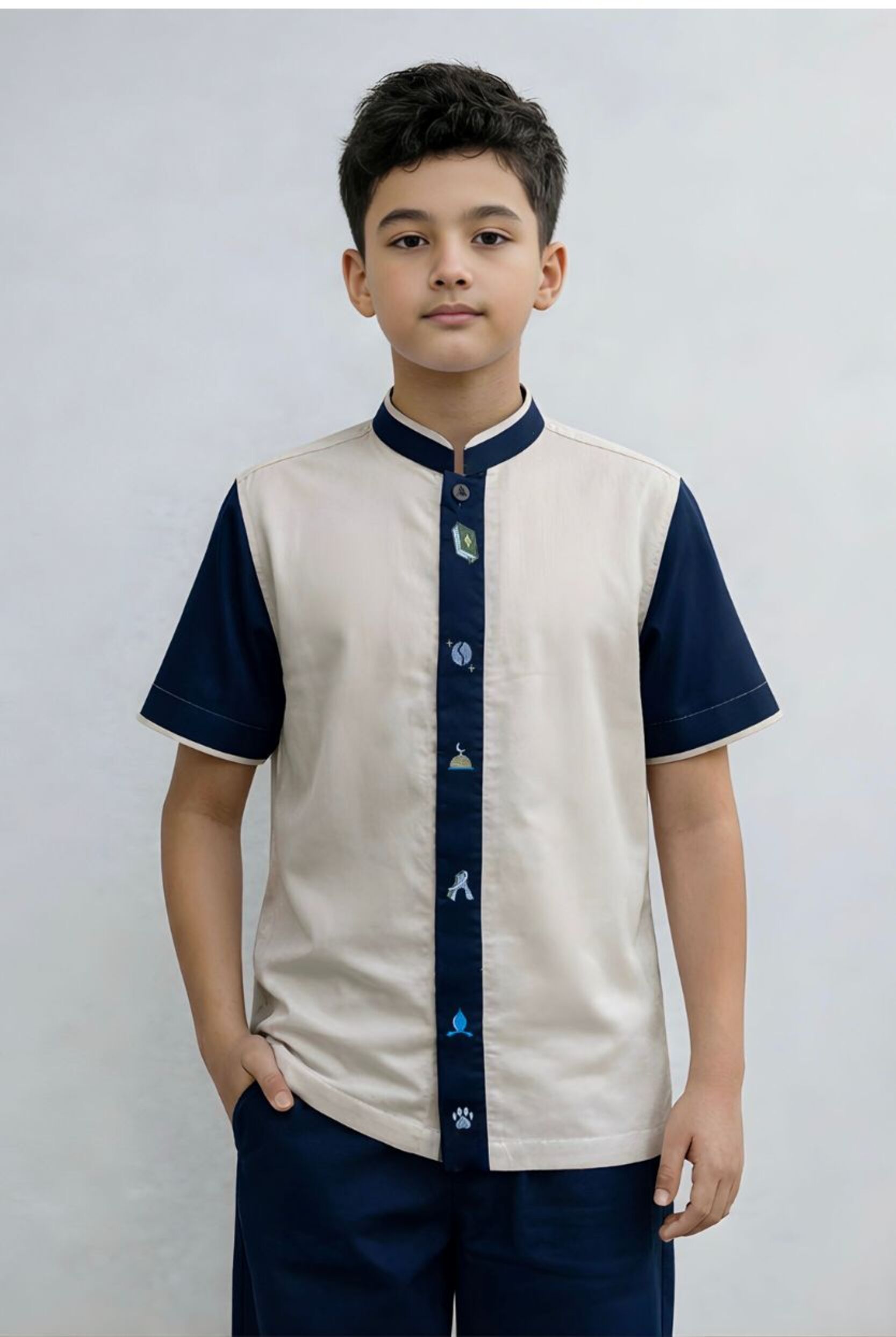 Warna baju : - Light cream warna dasar baju - Kombinasi warna navy di bagian plaket dan di lengan