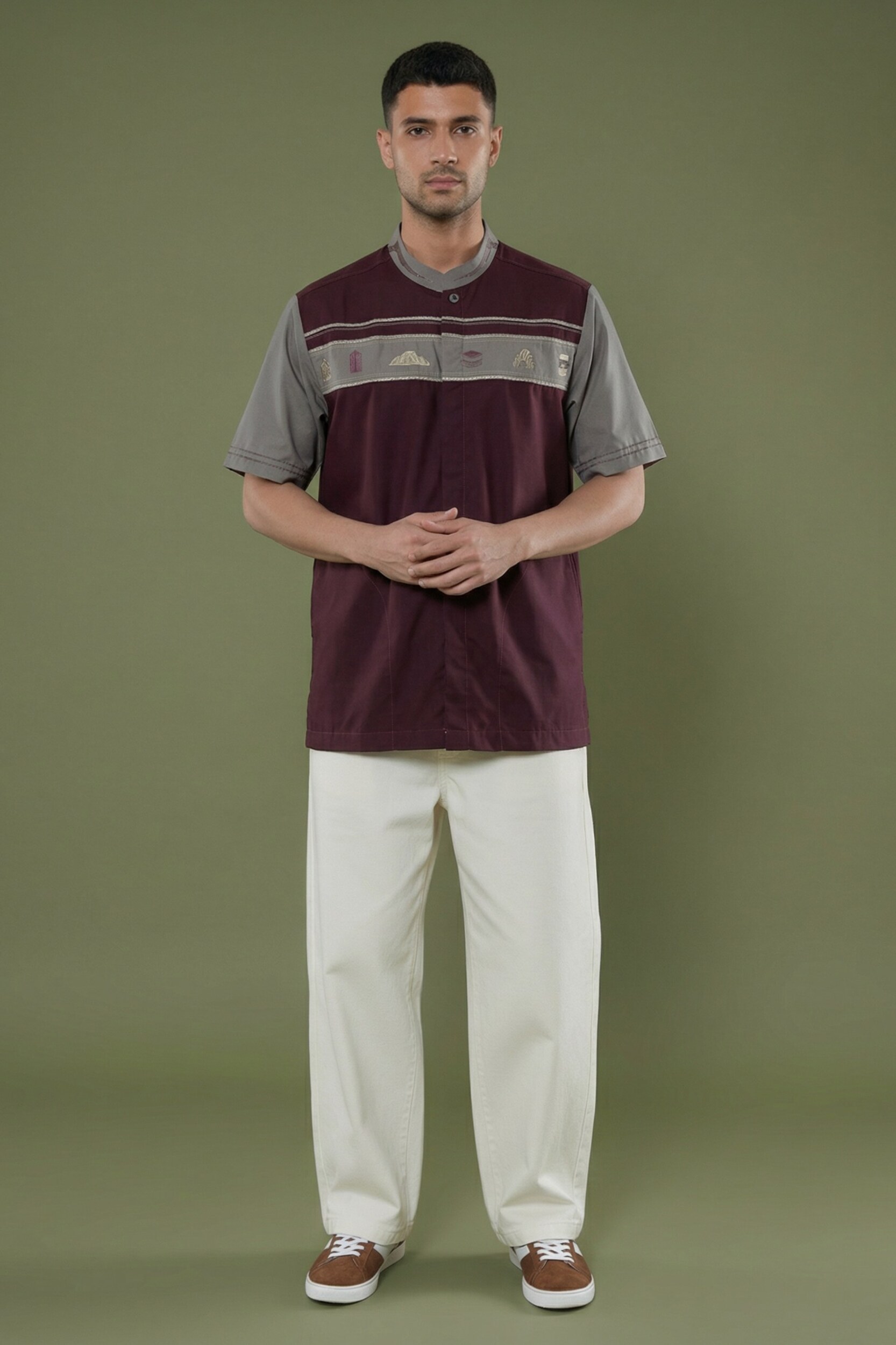Warna baju : • Burgundy untuk warna dasar • Grey untuk bagian kerah hingga lengan • Light brown, dark brown, grey dan burgundy untuk benang bordir