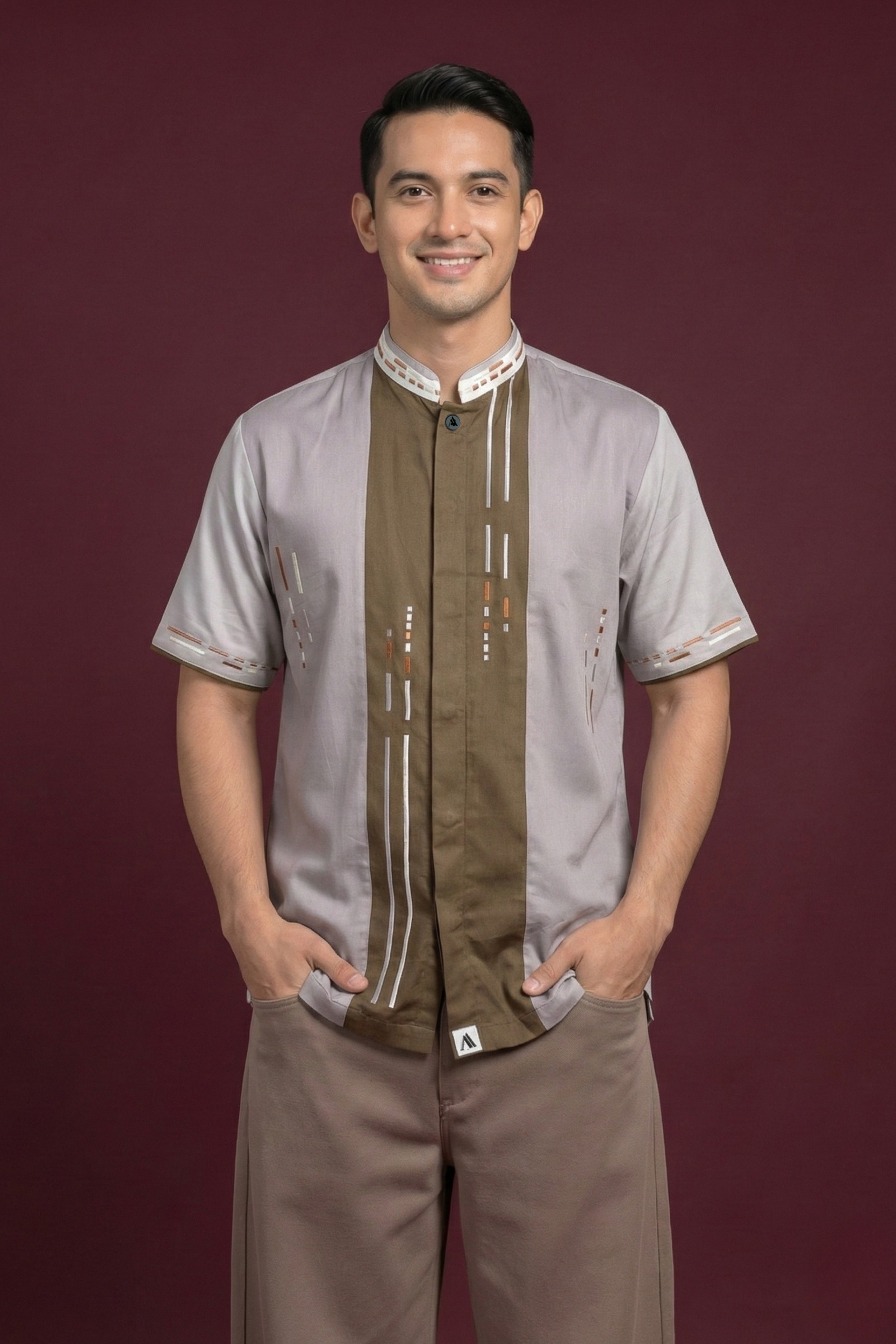 Lengan • Bahan katun twill premium • Warna lengan abu muda • List olive - Bordir berwarna putih dan orange bata