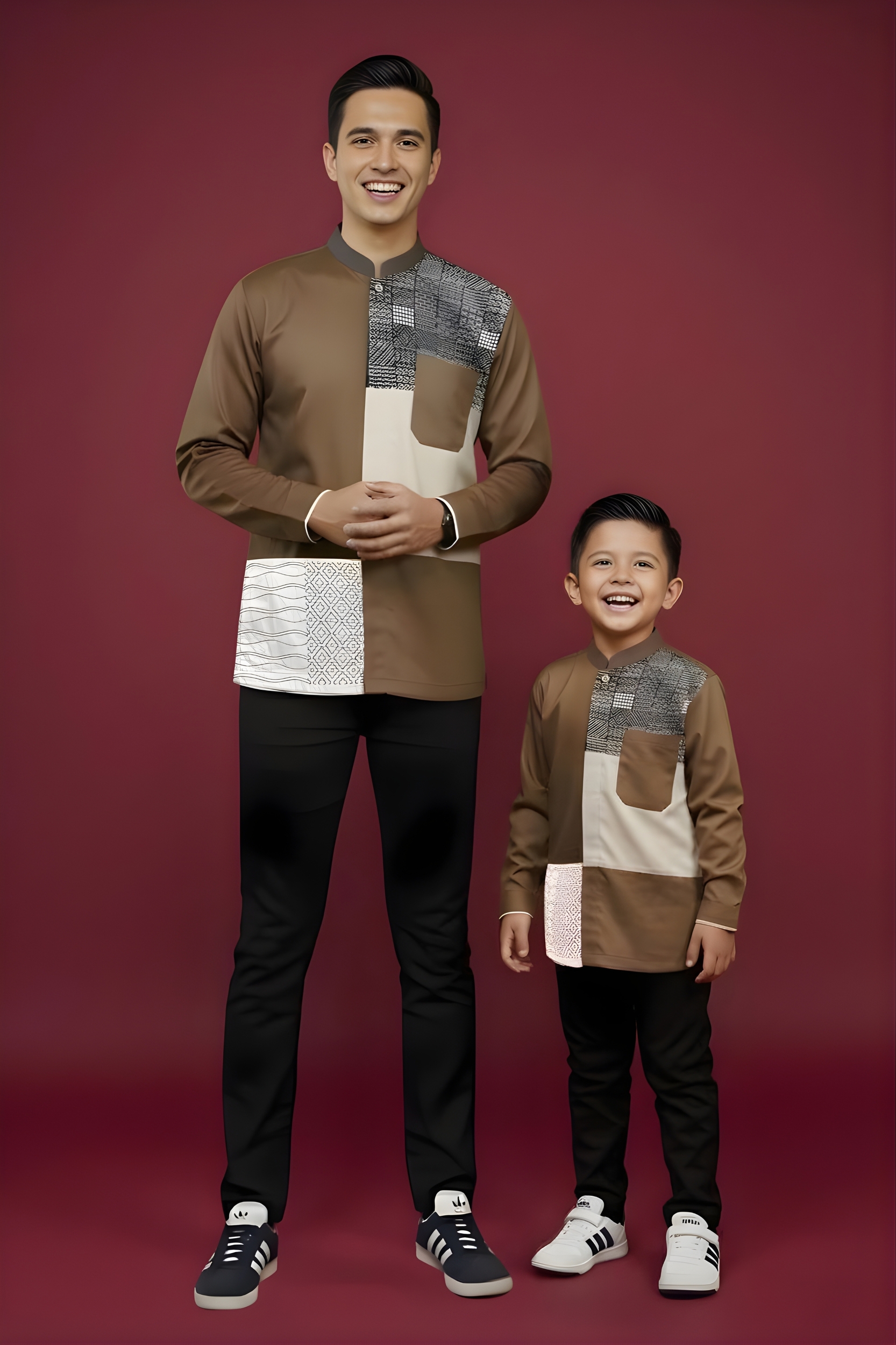 Detail * Kerah koko (kerah mandarin) * Full kancing sampai bawah * Variasi bordir bagian depan baju * Double plaket ( kancing tertutup ) * Terdapat SAKU DALAM pada bagian kiri dan kanan, serta SAKU tempel di bagian depan * Baju khusus lengan panjang couple (ayah-anak)