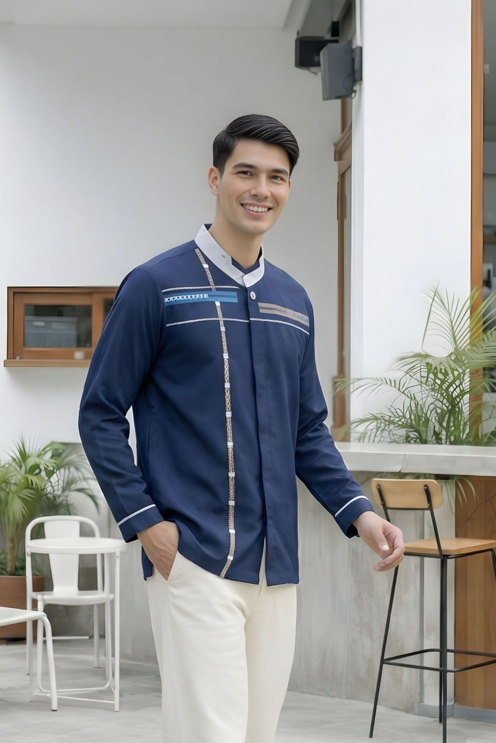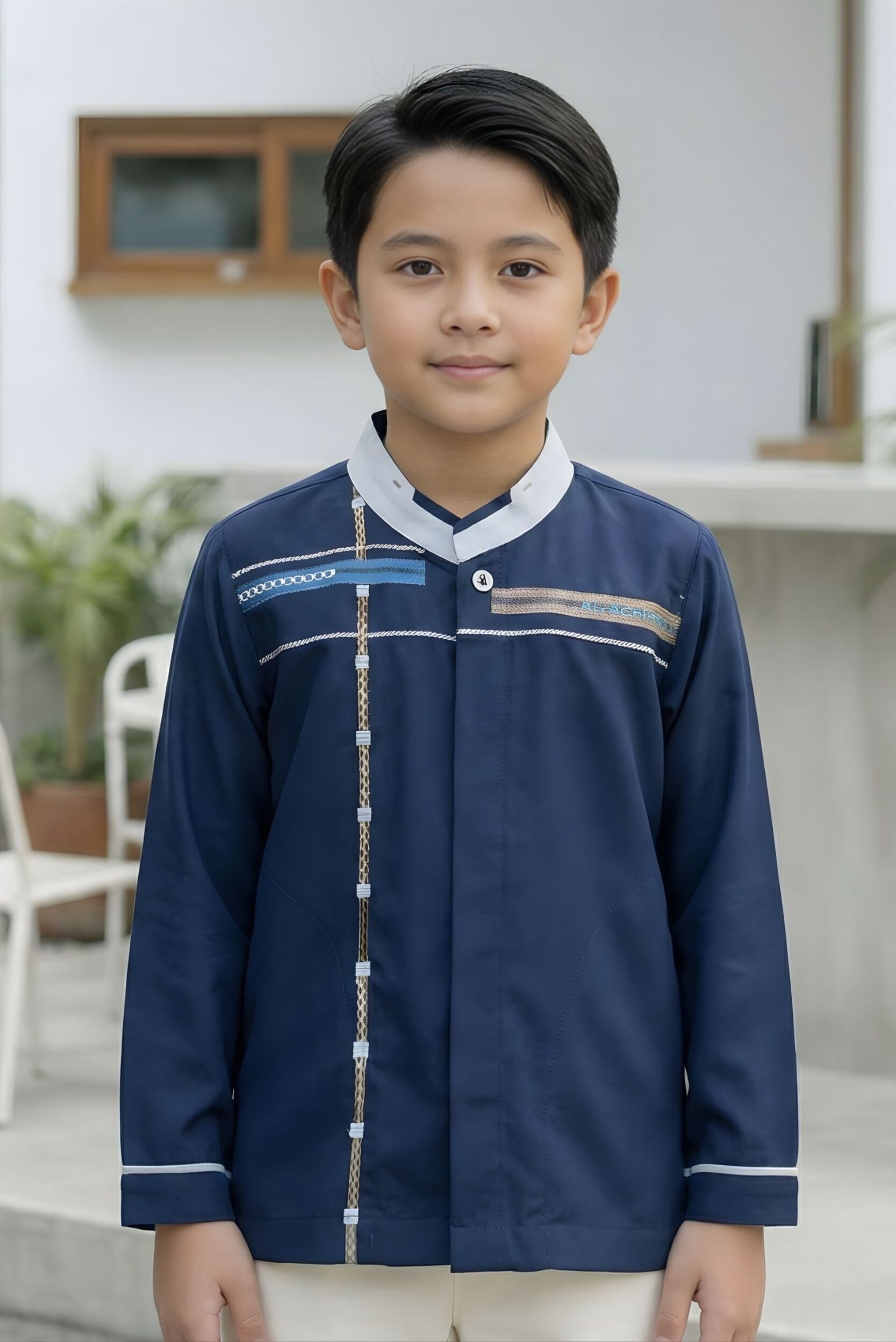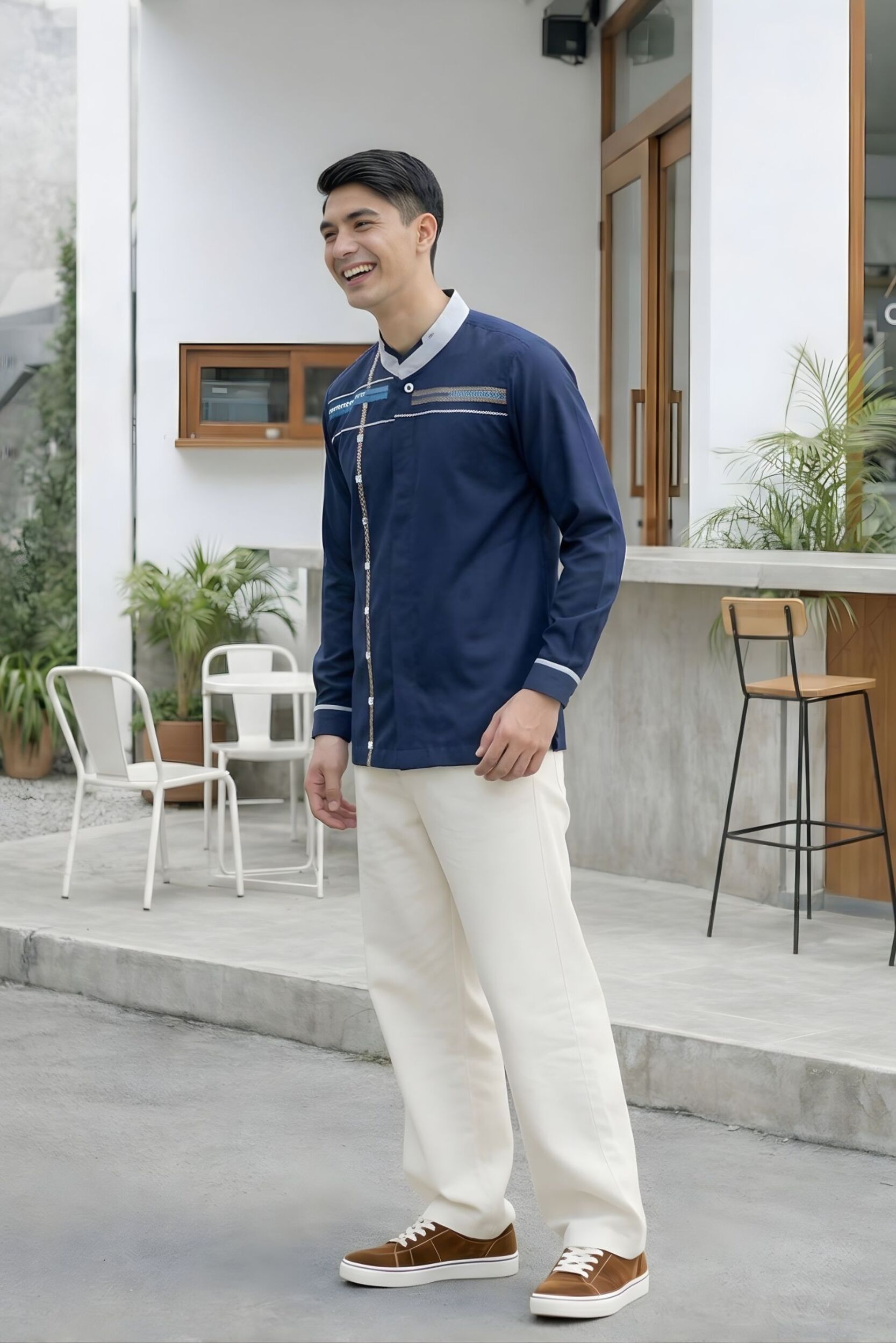 Warna baju : • Navy untuk warna dasar • Bordir dengan aksen motif garis vertikal dan horizontal di bagian depan baju • Benang bordir warna light brown, light grey, dan silver