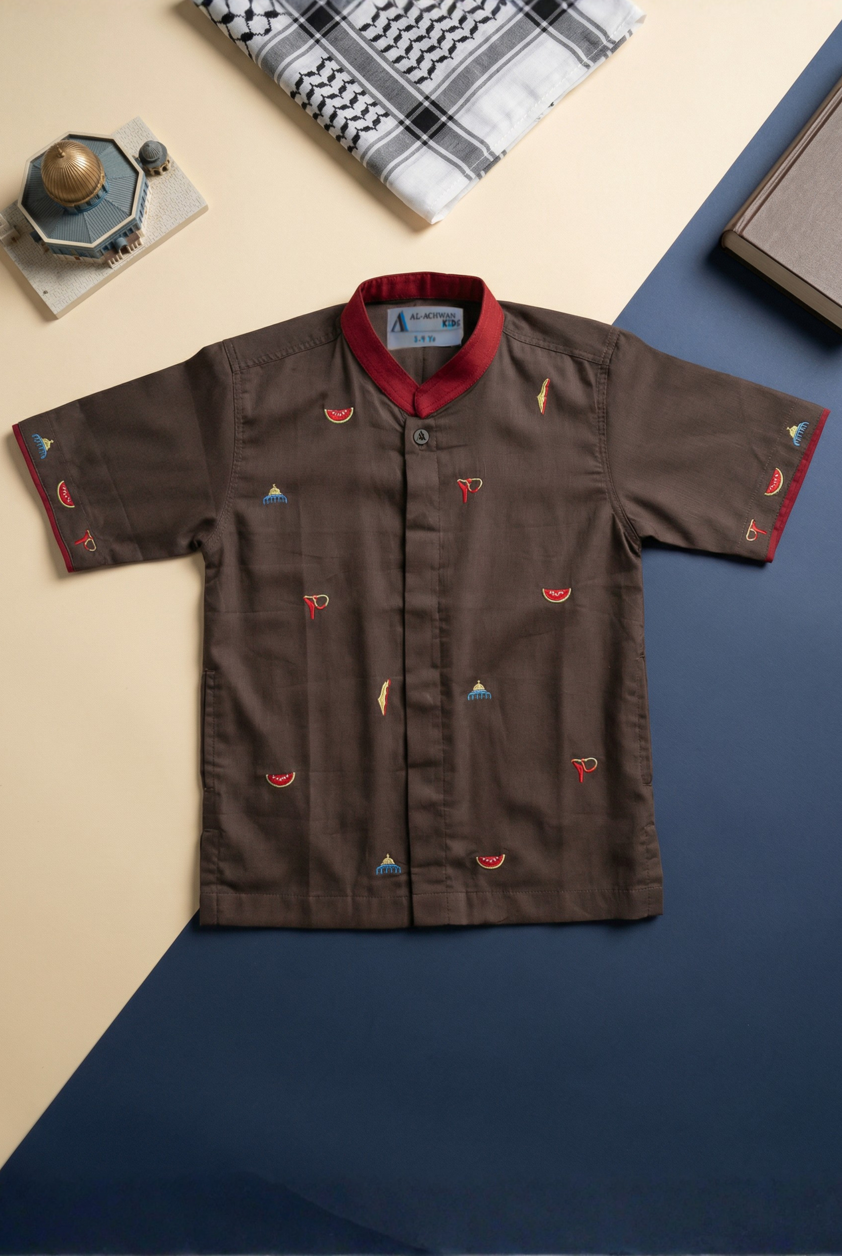 • Kancing dibagian depan baju (full kancing) • Terdapat 4 motif bordir karakter yaitu : semangka, ketapel, peta dan masjid • Terdapat SAKU DALAM pada kanan kiri baju • Baju khusus lengan pendek Couple